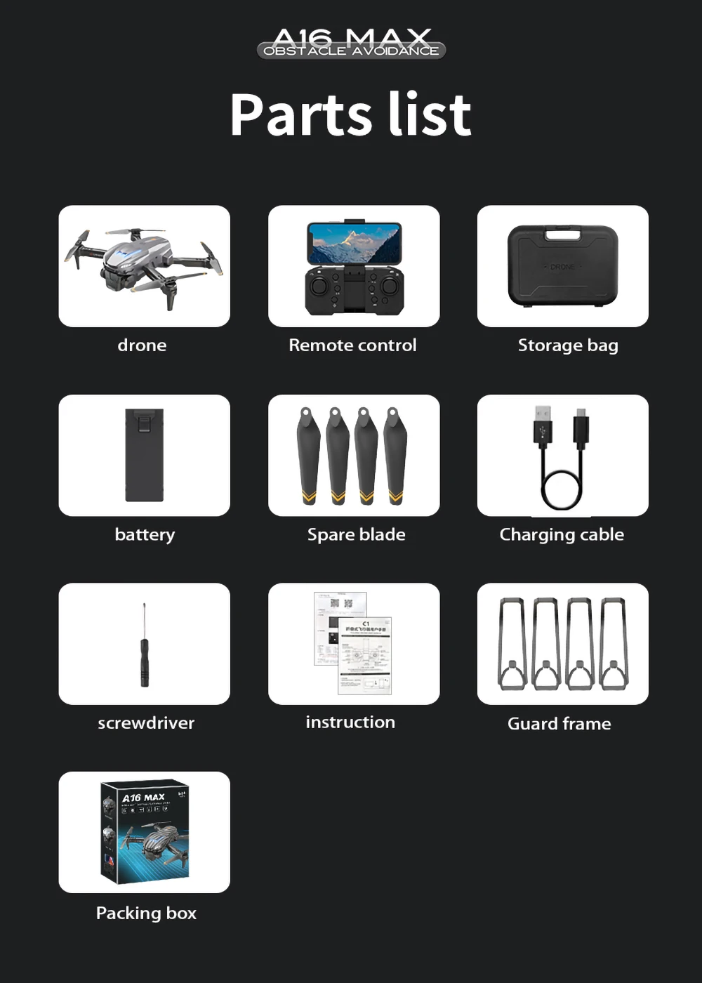 Configuração completa: drone * 1 controle remoto * 1 ventilador sobressalente * 4 saco de armazenamento * 1 bateria corporal * 1 cabo USB * 1 chave de fenda * 1 manual * 2