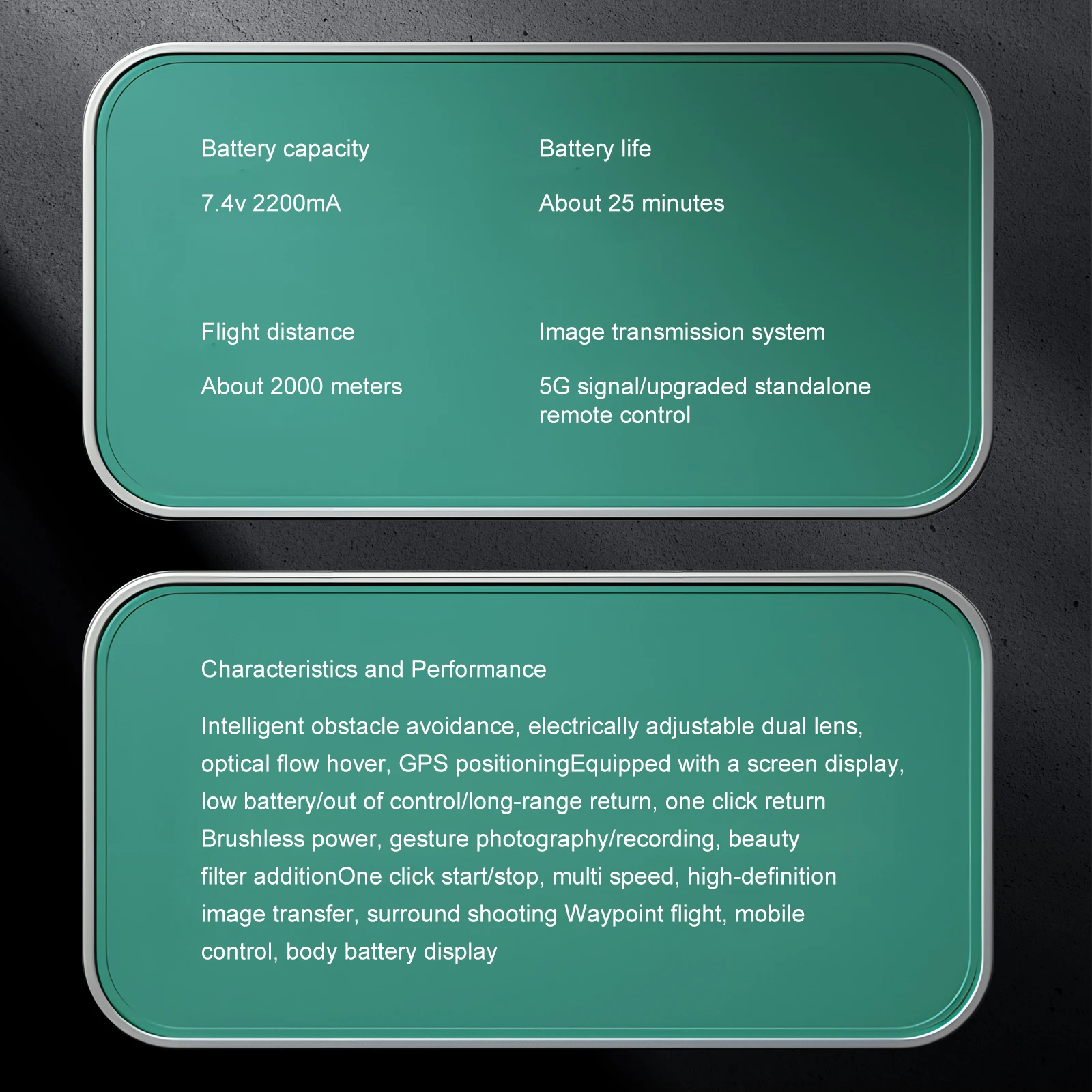– Tempo máximo de voo de 20 minutos. A bateria inteligente de alta capacidade 7,4 V 2200 mAh produz até 20 minutos de voo.