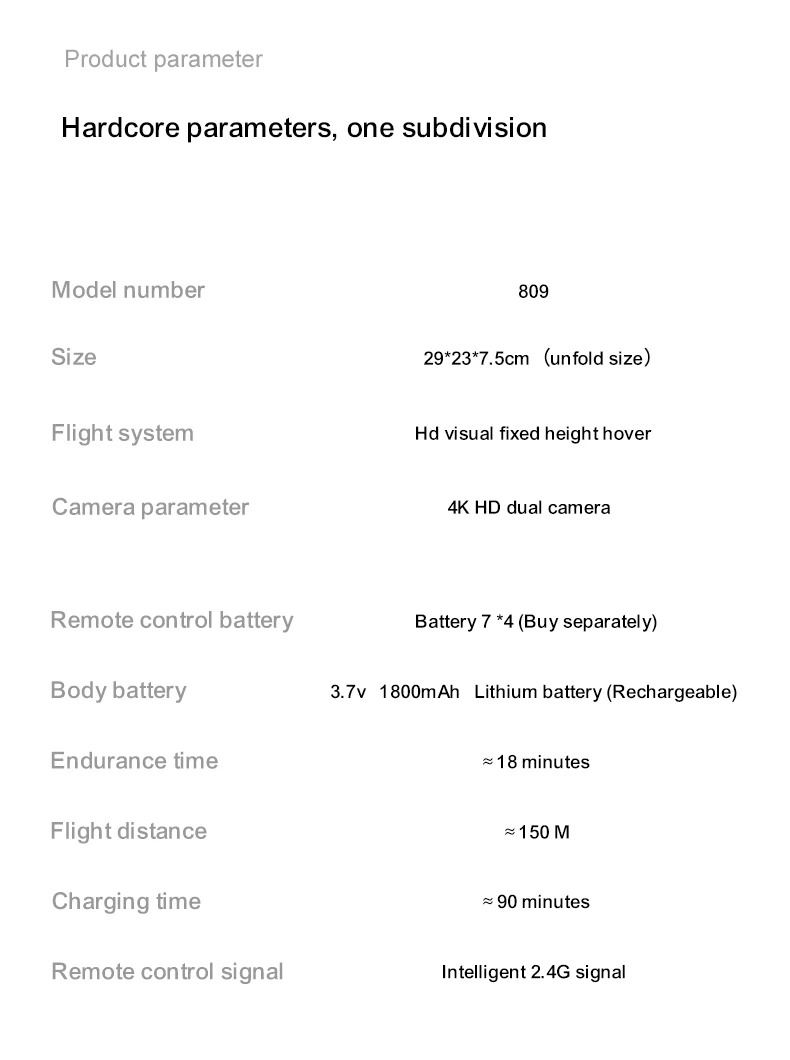 -O novo 809 permite que você aprenda rapidamente a voar-qualidade de imagem 4K HD, desempenho HD detalhado em camadas, saída HD de grau de filme-design de câmera dupla, ângulo plano mais abrangente, ângulo ajustável, câmera frontal também pode ser ajustado por 90 °-Projeto modular da bateria, longa vida, boa controlabilidade 1800mAh capacidade, Pode voar 15-18 minutos-impacto de alta pressão, tornar o tiro mais estável e claro, posicionamento preciso anti-shake, tornar o tiro mais estável e claro, informações ambientais em tempo real, tecnologia preta inteligente partilha maravilhosa, abrir nova criação, desbloquear mais métodos de voo, seguimento inteligente (identificação automática, bloqueio, tiro), Trajetória do voo (conforme a trajetória do voo). Voo do ponto central (em torno do alvo), reconhecimento inteligente (você pode tirar fotos com gestos), modo sem cabeça (sem necessidade de distinguir a direção do voo)-material PA/PC de grau de aeronave, portátil, resistente a quedas, resistente à pressão, reduzir o risco do voo