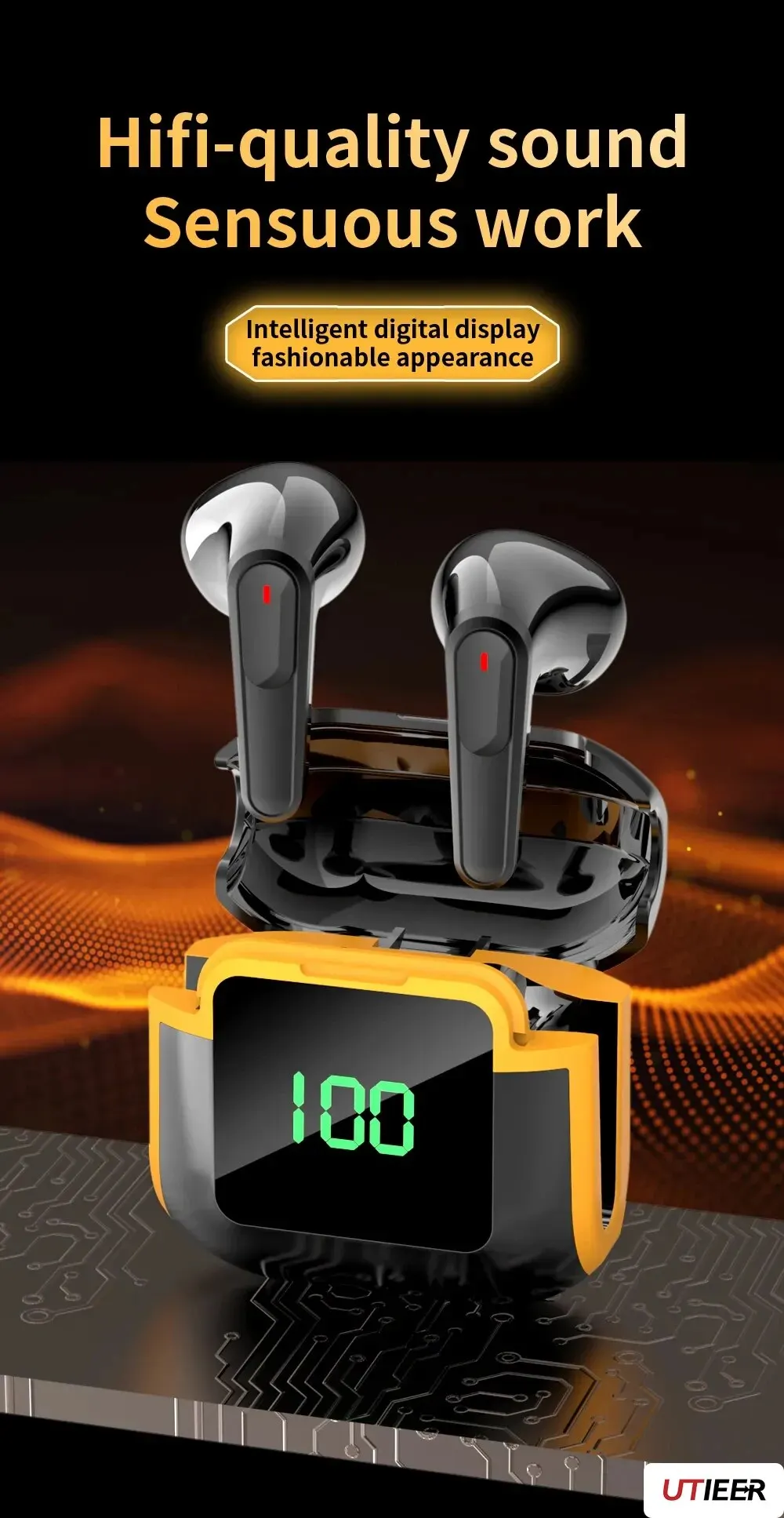 Pro90 Sem Fio Bluetooth No Ear Display Digital Inteligente Touch Grande Vida Da Bateria, Jogos De Música Sem Fio Gaming – Cor Preto e Amarelo – Produto Novo